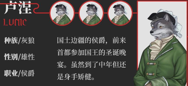 主管国土边疆桑尼莱郡的侯爵,在赶来王都参加国王的圣诞晚宴时由于暴风雪,只能在白星酒馆暂避。虽然到了中年但还是身手矫捷。对佣人的要求很高,创下过一个月辞换16个佣人的记录。