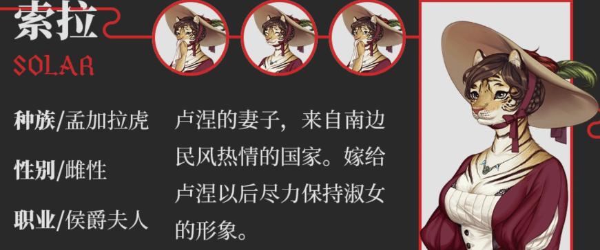 卢涅的妻子,来自南边民风热情的国家。嫁给卢涅以后尽力保持淑女的形象。她并不像外表看上去那么凶恶,而是对所有人都彬彬有礼。虽然有时候她和侯爵会进行并不那么友好的交流,但最终都是她对侯爵的爱占了上风。来自商人家庭的她擅长计算,经常帮助侯爵进行一些要事的决断。