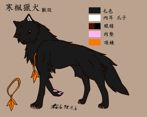 寒楓獵犬有著黑色的毛,棕色偏紅的雙眼,以及胸前的楓葉型項鍊(出生時就有了)