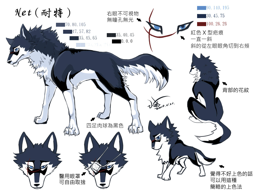 特徵:臉上深藍色的毛在眼下有個菱角呈對稱 右眼上有封印圖騰,所以右眼是看不到的(右眼無光)